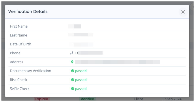 Simple Process: The verification details are displayed in a clear, accessible modal box, allowing you to track and manage client verification with ease.