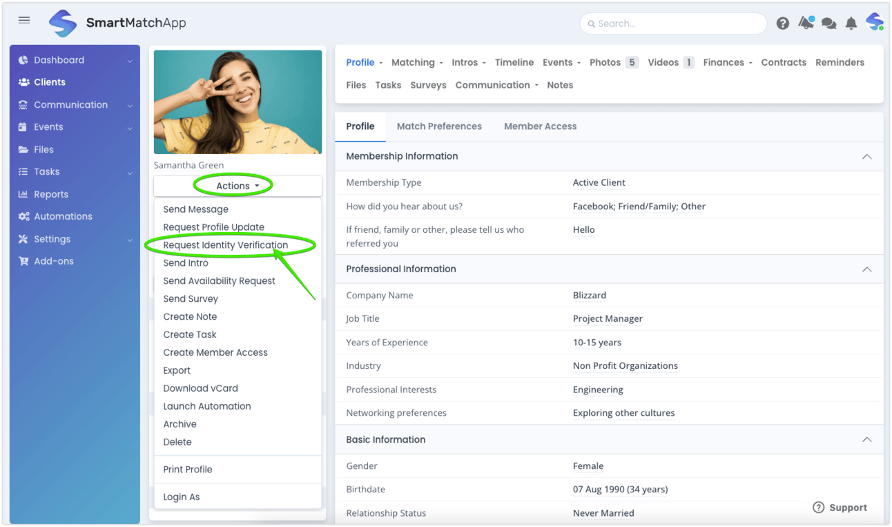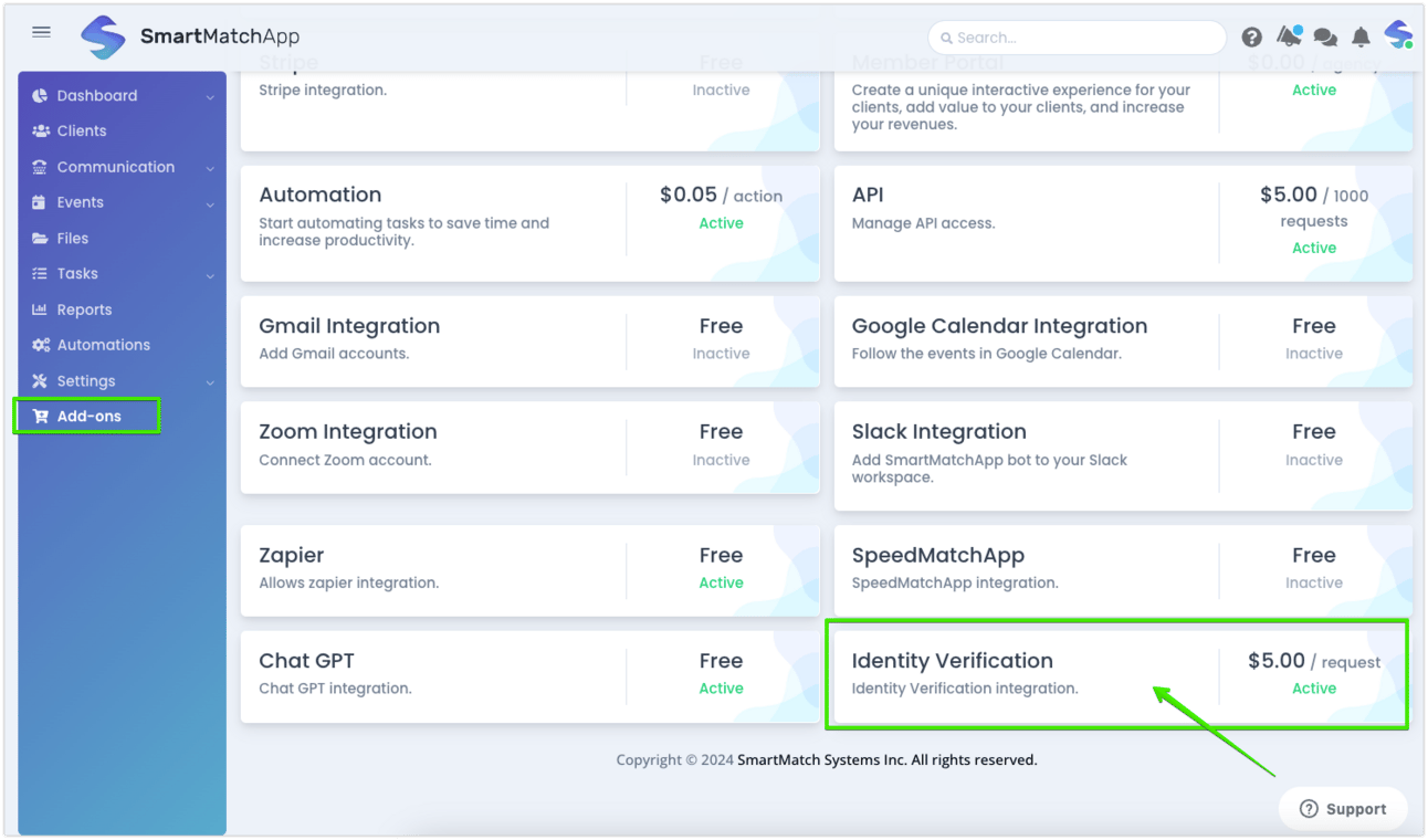 To enable ID Verification, head to the Add-Ons page in SmartMatchApp and activate it. Once enabled, you’ll see a new option, "Request Identity Verification," under the Actions tab on any client’s profile. From there, you can manage the process with just a few clicks.